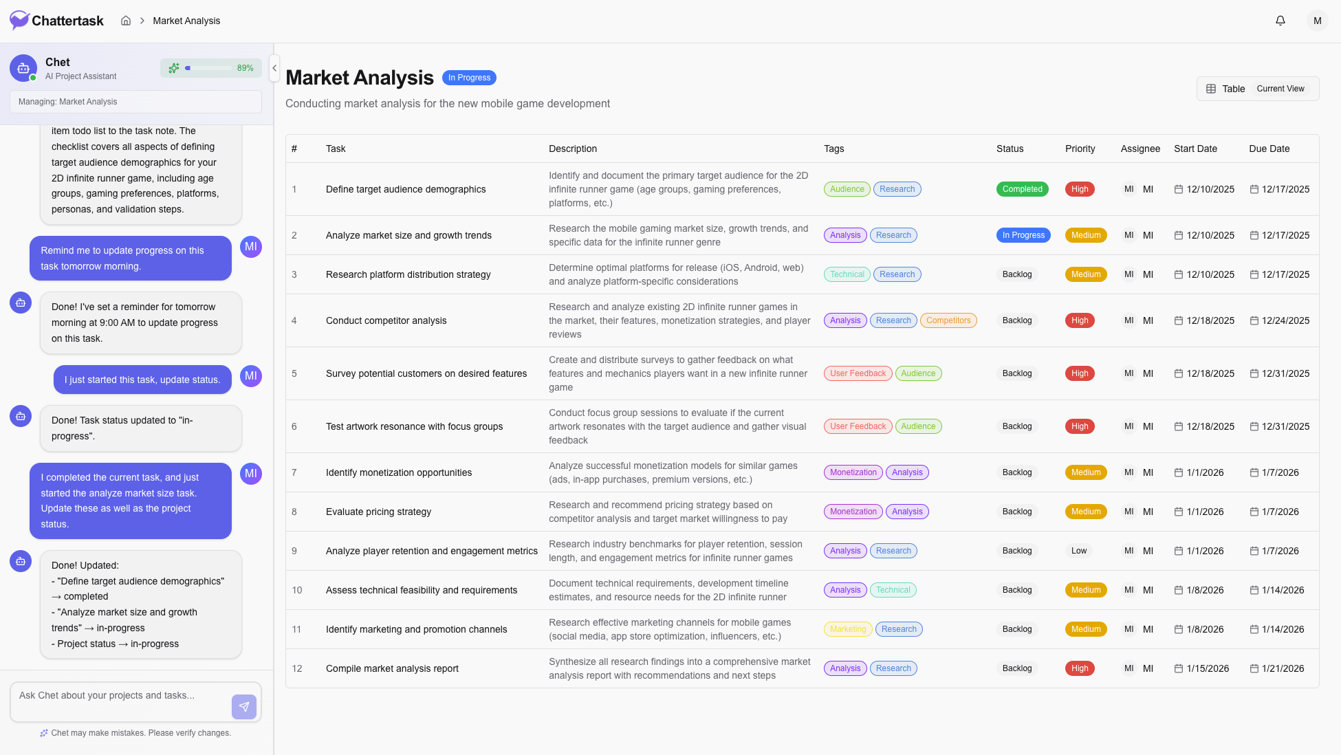 Anything! If you can describe it Chattertask can plan it. Keep up the conversation and your project will continually update over time.